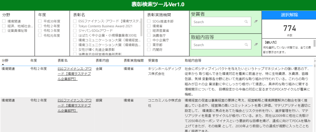 分野や表彰年度などに応じて、表彰事例を検索することができます。取組内容についてキーワード検索することも可能です。